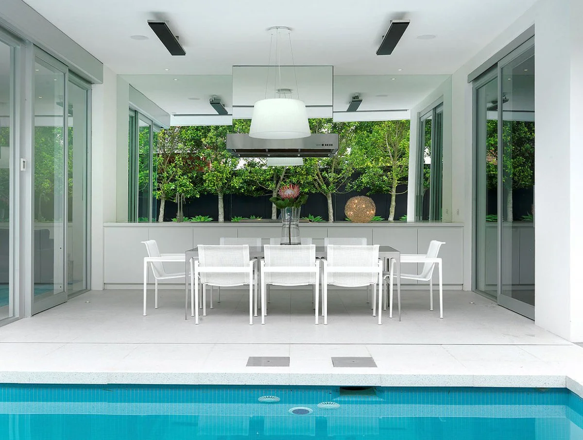In order to make the Alfresco Dining usable all year round, heating was a necessary element. Giant slabs of mirror reflect the garden into the space, and white terrazzo tiles flow seamlessly from the interior to exterior spaces.