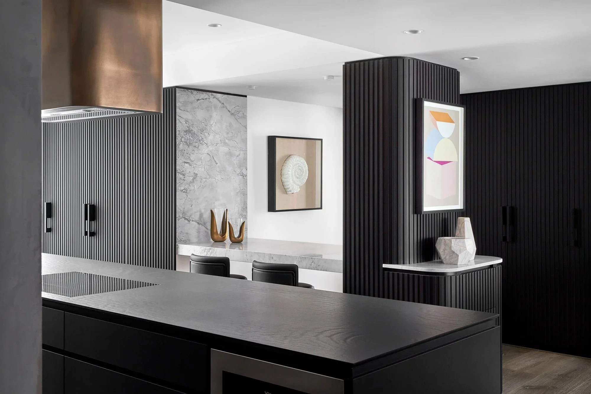 The clients were downsizing from a rural property and wanted a feeling of timeless elegance while maximising the sense of space. We introduced curved and battened cabinetry that flowed effortlessly from one area to another, concealing storage while maintaining visual simplicity. Lighting, furniture, and artwork were all specified to complement the architecture, not compete with it. This is the essence of high end interior design in Melbourne, where every detail serving a purpose, every gesture intentional.